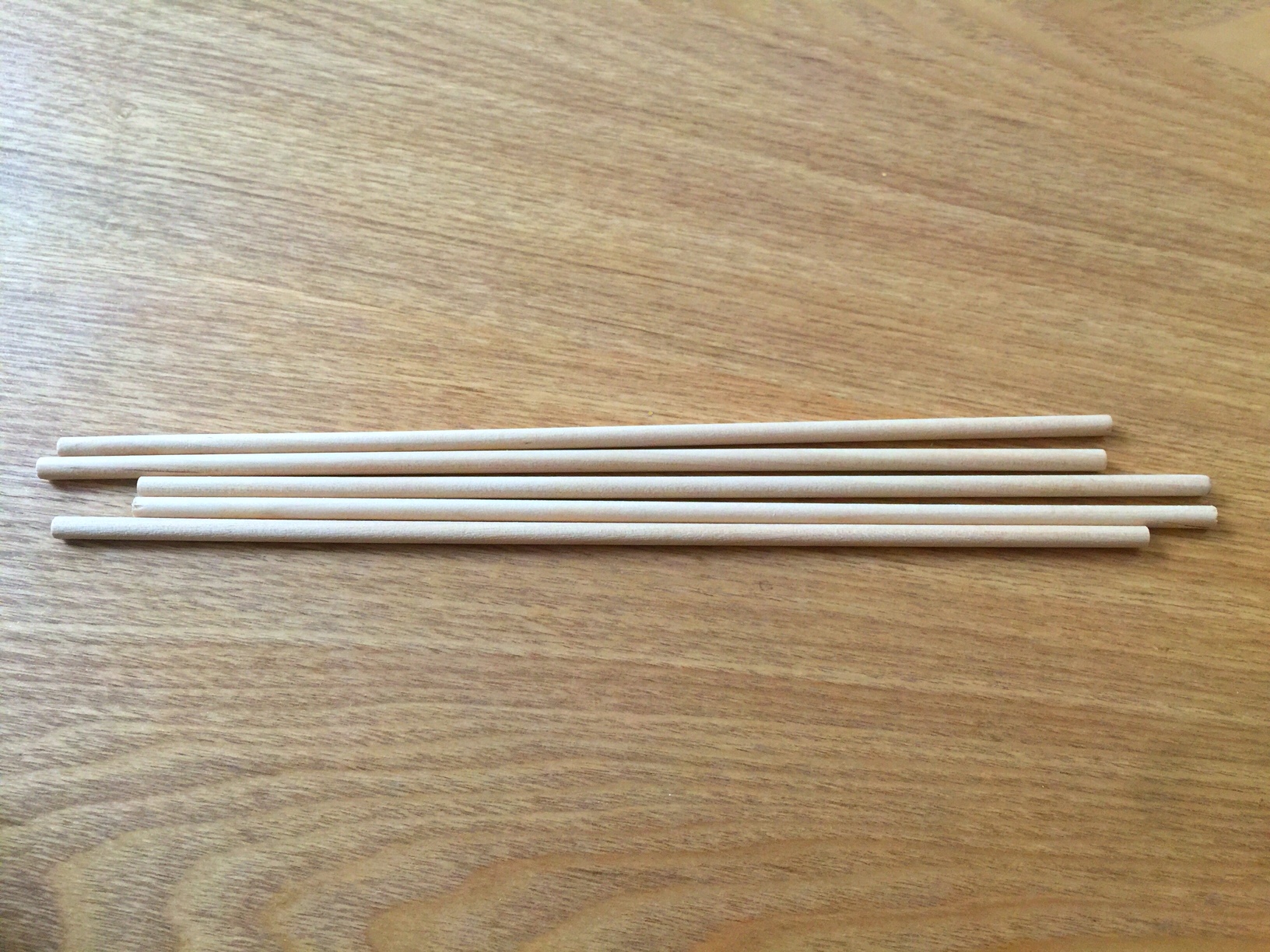 Use your hot glue gun to add your green strips to the wooden dowels.