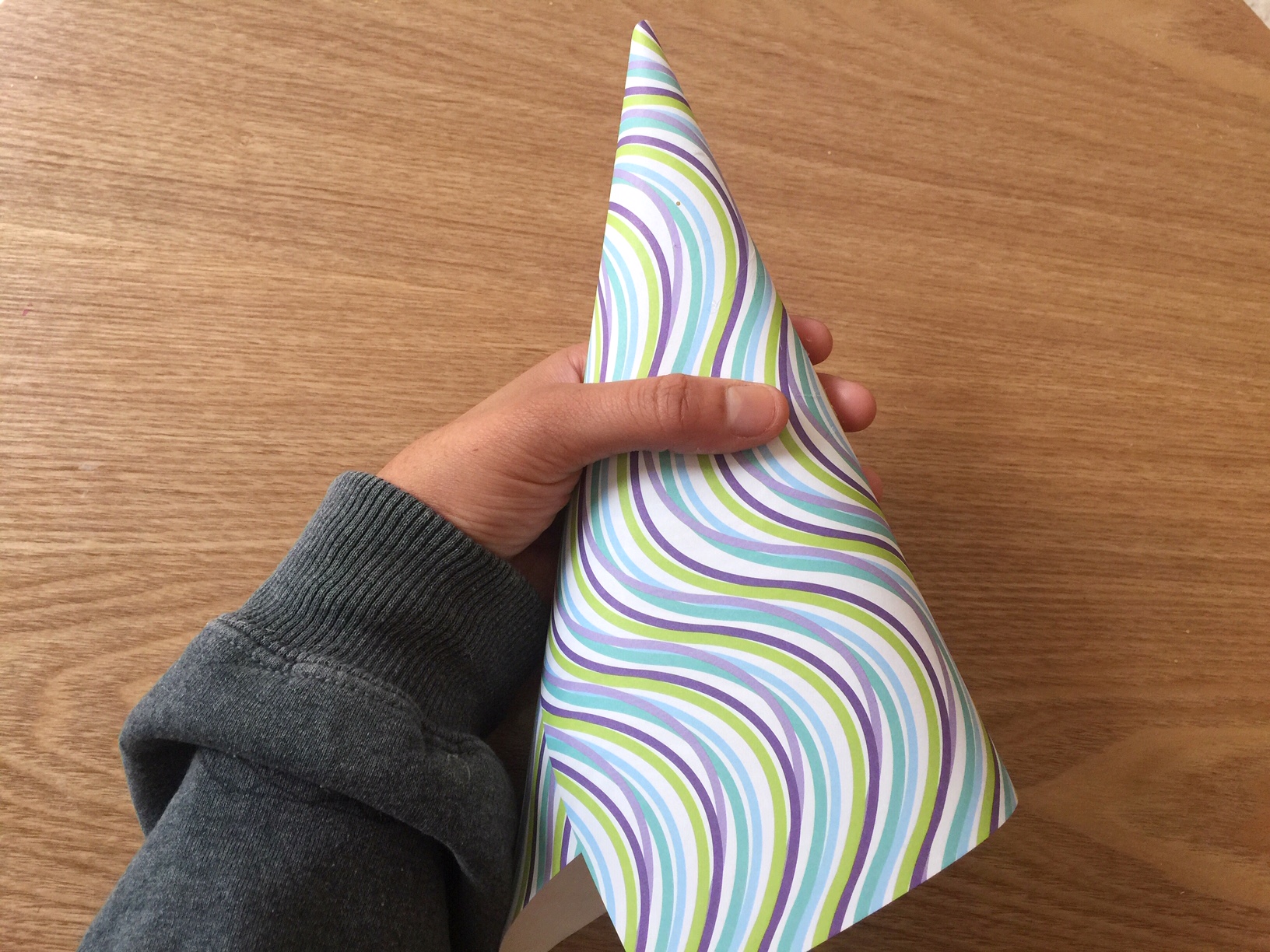 Choose a patterned piece of paper. This will be your unicorn horn. Roll it into a cone shape.