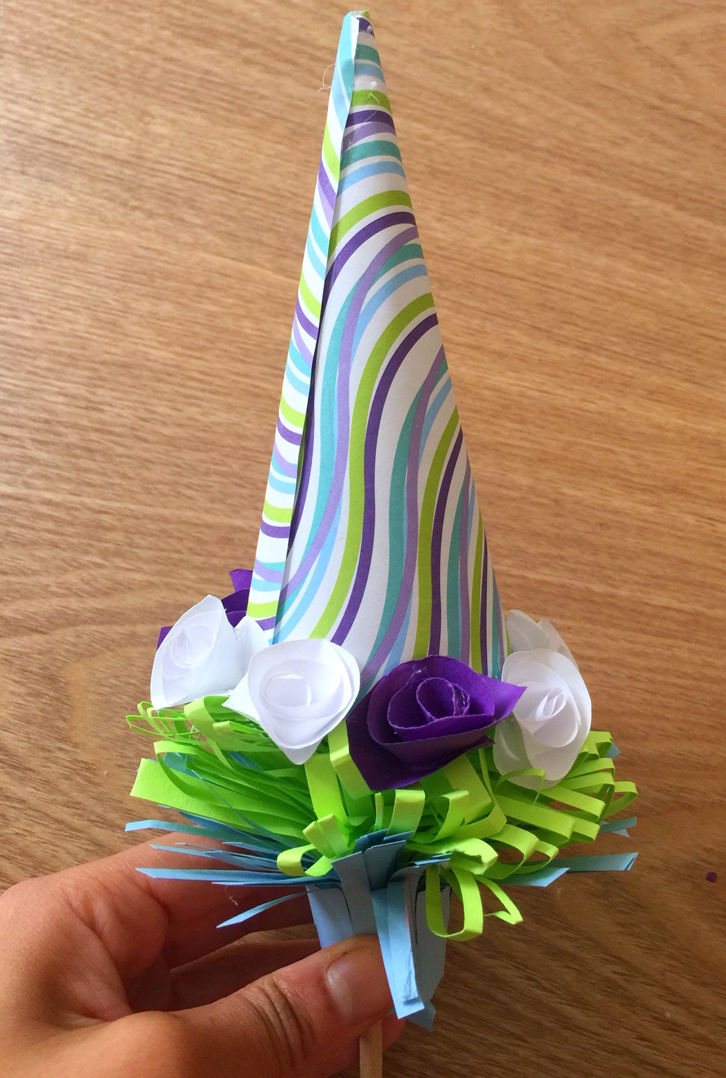 Add small flowers, pom poms and green strips to the bottom of your unicorn horn, until it’s full and ready to top your bouquet.