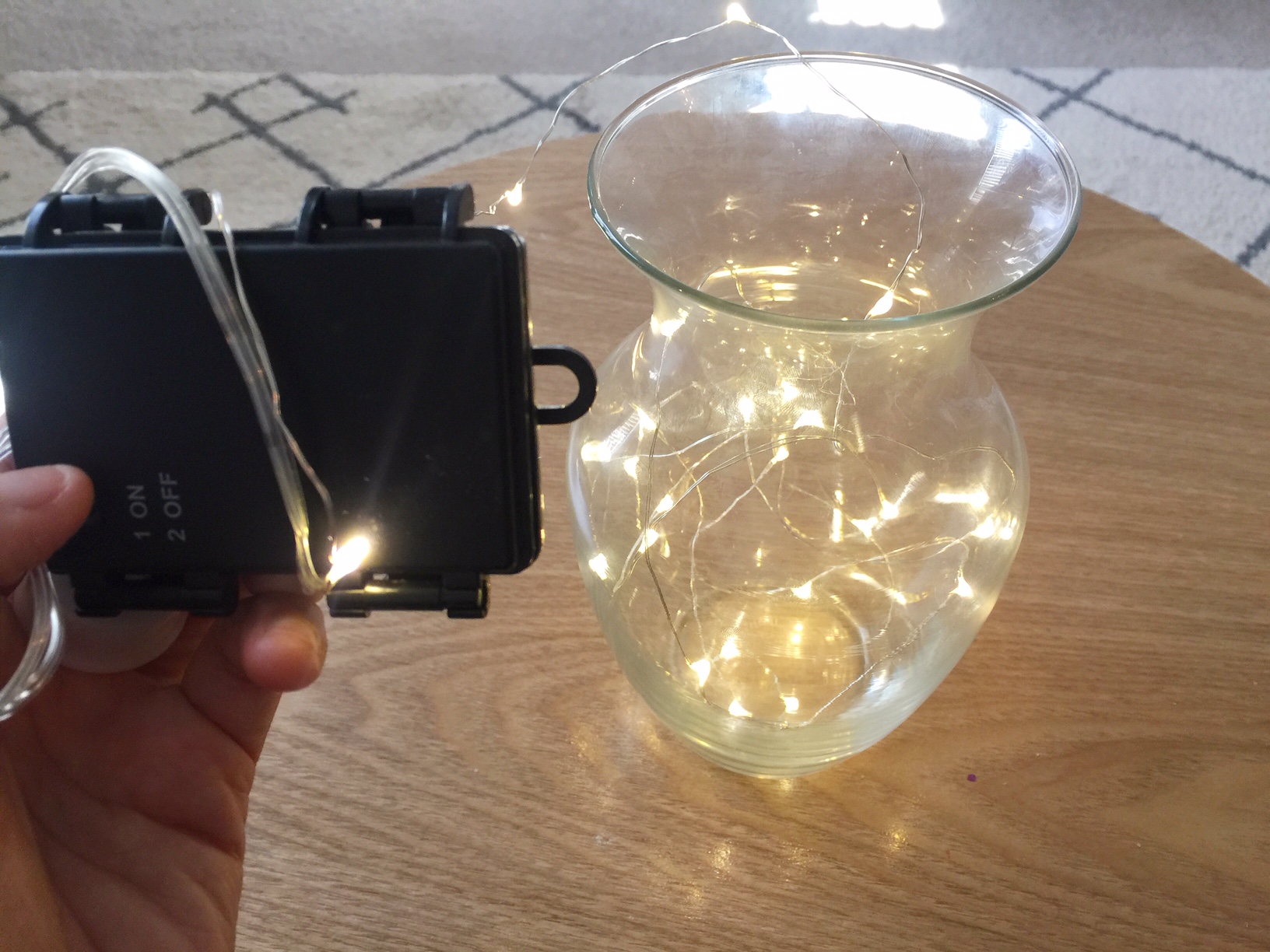 Add your fairy lights to the bottom of your vase, by allowing them to tangle slightly in a loose ball. Leave your battery box out, so that you can hide it after adding your flowers.